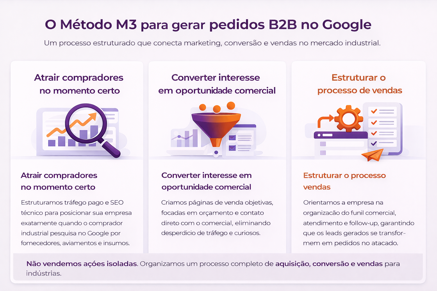 É uma conversa para entender sua operação, seu momento e avaliar se o método da M3 Mkt faz sentido para a realidade da sua indústria.