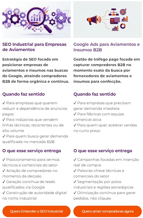 Estratégia de SEO focada em posicionar empresas de aviamentos e insumos nas buscas do Google, atraindo compradores B2B de forma orgânica e contínua.